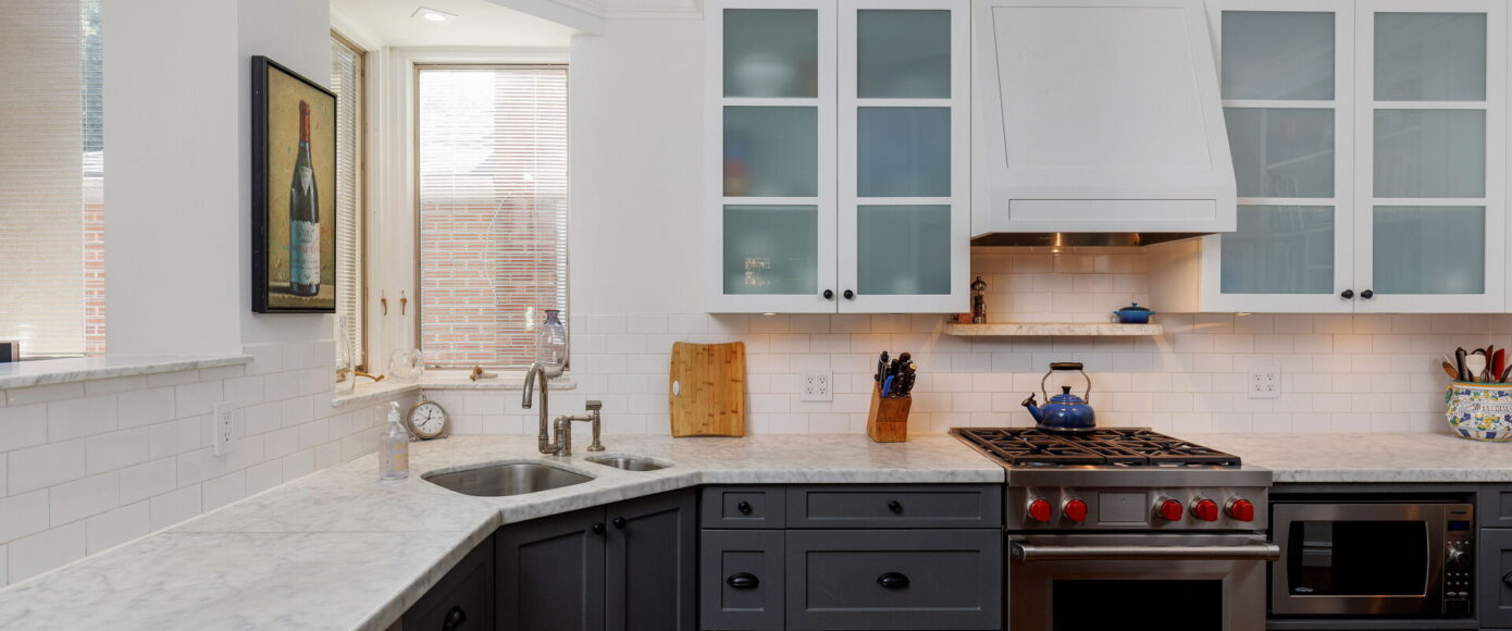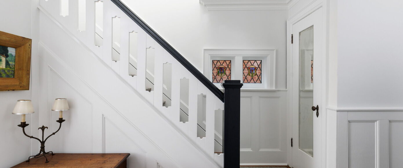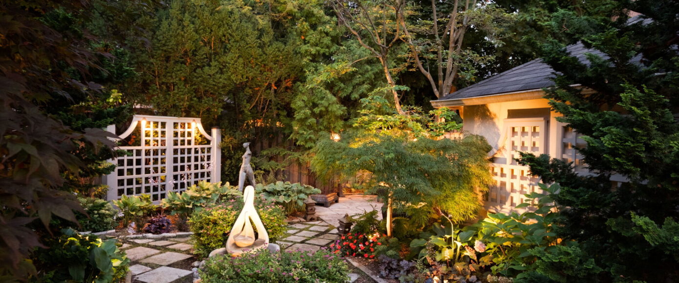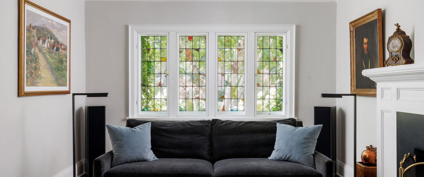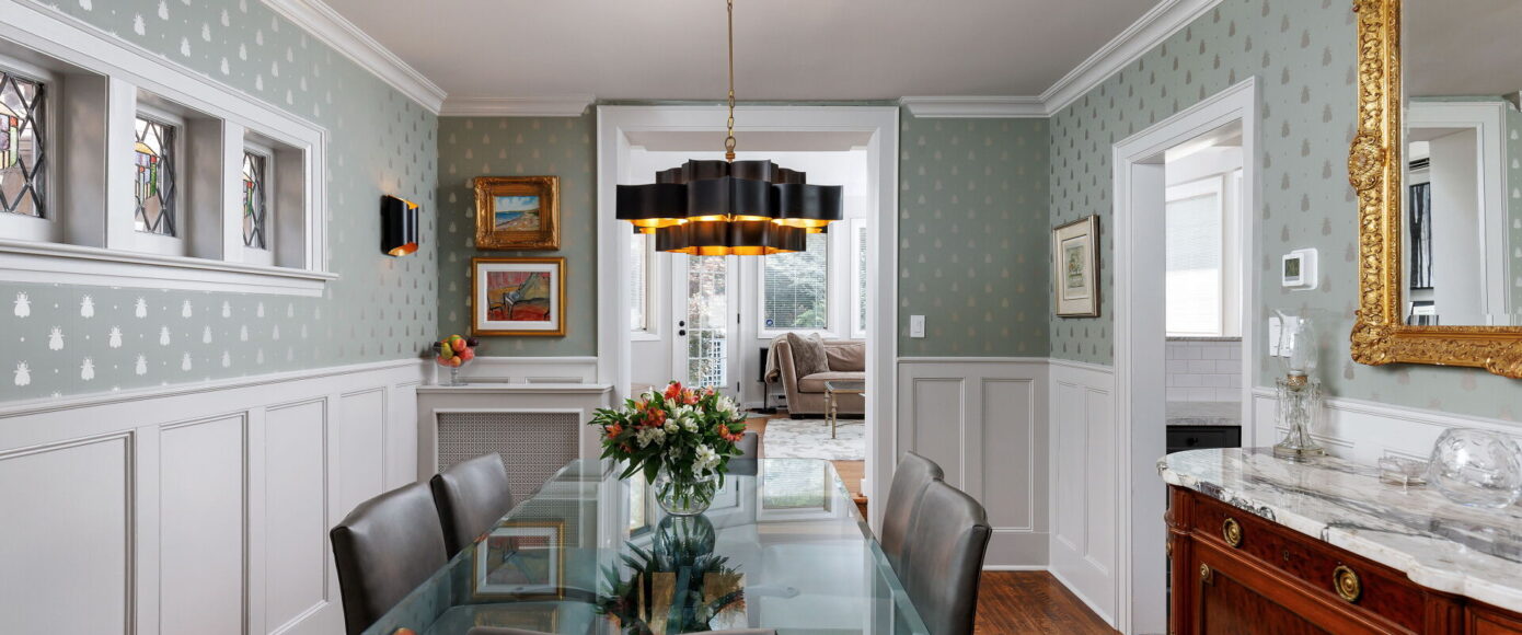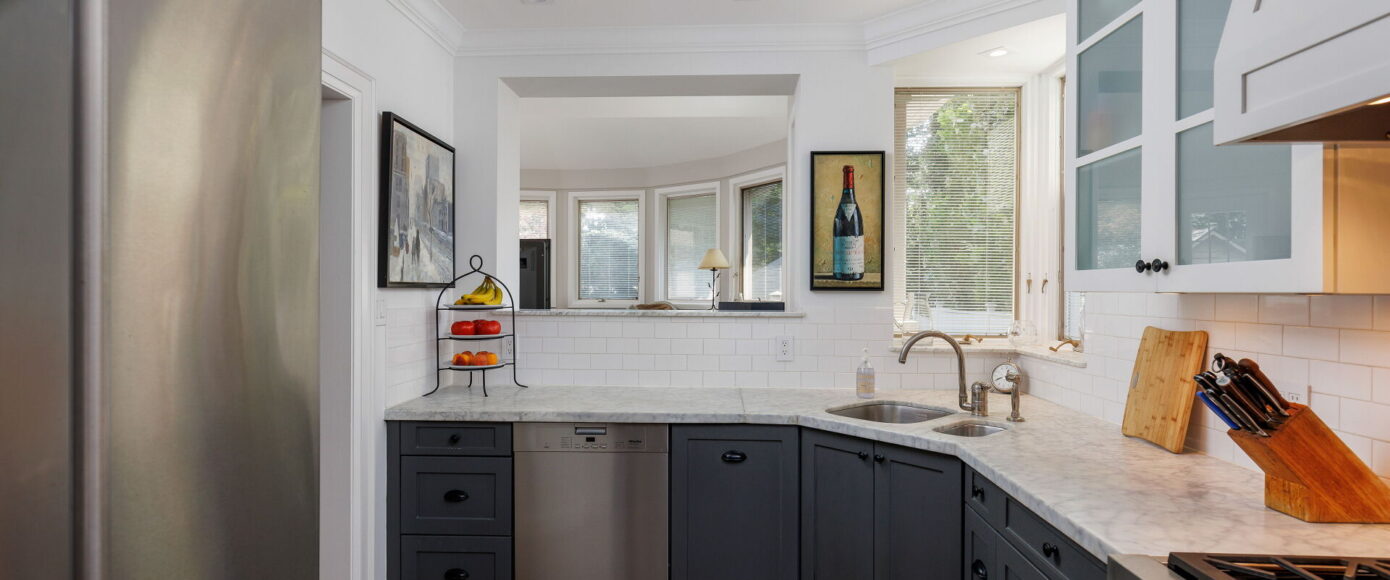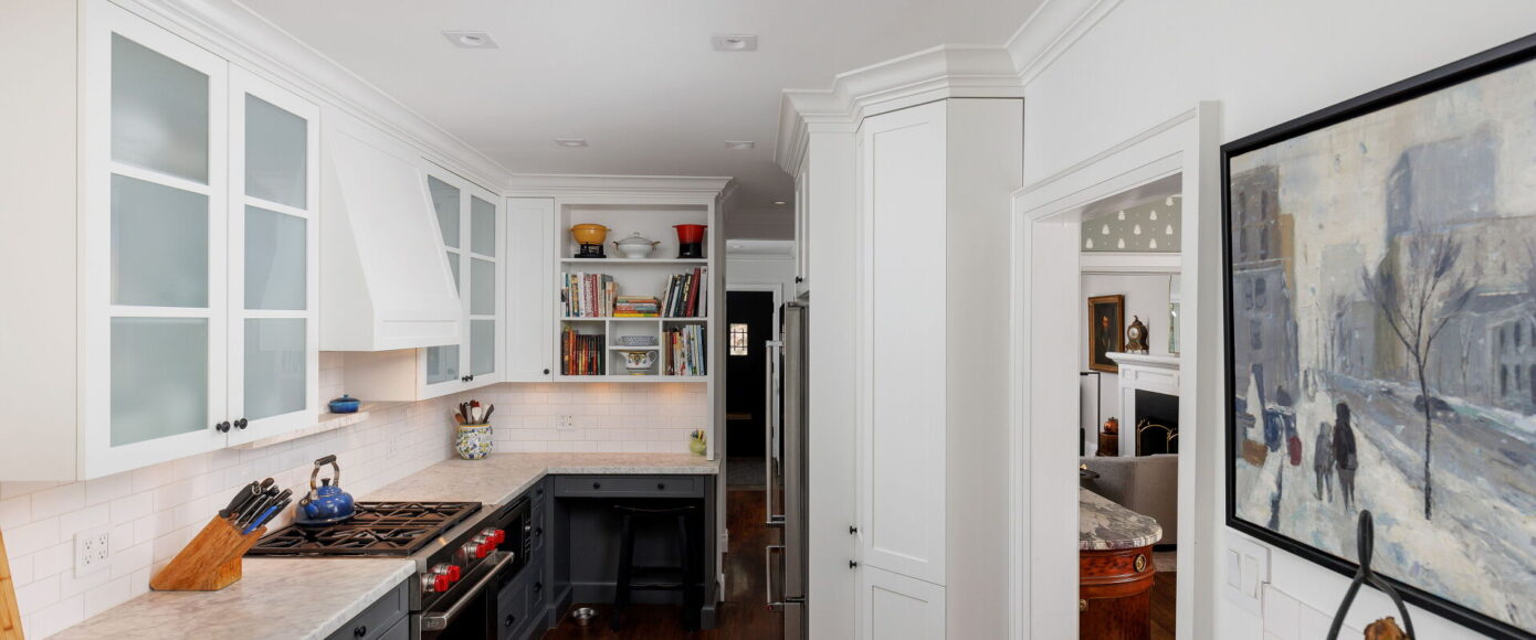 Inside, the home blends historic charm with thoughtful modern updates. Stained and leaded glass windows, crown moulding, and a marble-surround fireplace evoke traditional craftsmanship, while French doors lead to a cozy dining room surrounded by wainscotting. The updated kitchen, fitted with Italian Carrera marble and a full suite of luxury appliances, looks to the family room, where a skylight and garden views create an atmosphere of light and ease. A walkout extends the living space outdoors to the stone patio and private entertaining area where you will find vibrant gardens complete with a water feature.