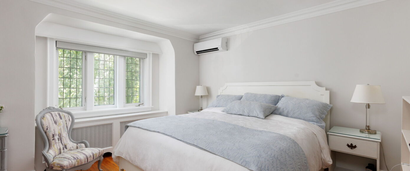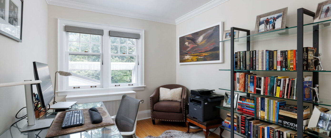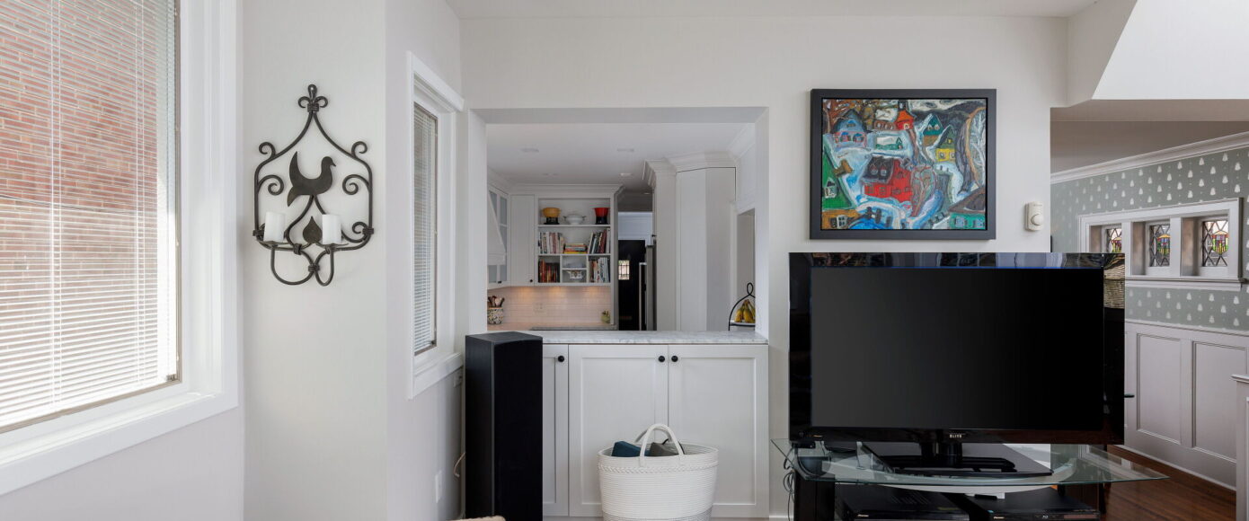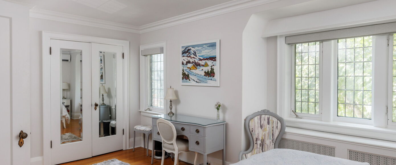 Original charm meets modern comfort in the principal rooms, where stained and leaded glass windows, wainscotting, and a marble-surround wood-burning fireplace bring warmth and elegance. The dining room features classic sconces, while the living room’s French doors open the space gracefully. The kitchen is fitted with Italian Carrera marble counters, custom pantry storage, and a full suite of premium appliances—including Wolf, Miele, and KitchenAid—along with a cozy work nook and sightlines into the family room. Flooded with natural light from a skylight and a wall of windows, the family room offers an AC wall unit, pot lights, and a walkout to the stone patio and private entertaining area.