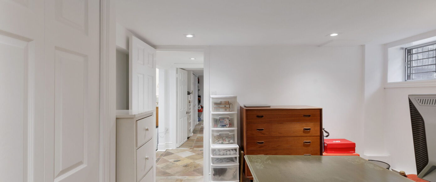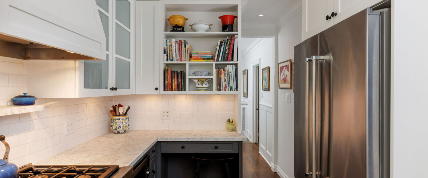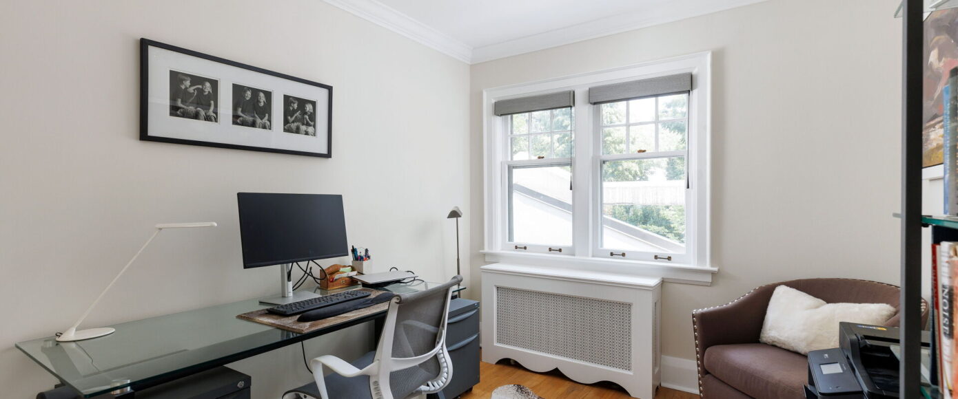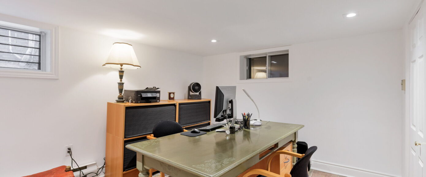 Original charm meets modern comfort in the principal rooms, where stained and leaded glass windows, wainscotting, and a marble-surround wood-burning fireplace bring warmth and elegance. The dining room features classic sconces, while the living room’s French doors open the space gracefully. The kitchen is fitted with Italian Carrera marble counters, custom pantry storage, and a full suite of premium appliances—including Wolf, Miele, and KitchenAid—along with a cozy work nook and sightlines into the family room. Flooded with natural light from a skylight and a wall of windows, the family room offers an AC wall unit, pot lights, and a walkout to the stone patio and private entertaining area.