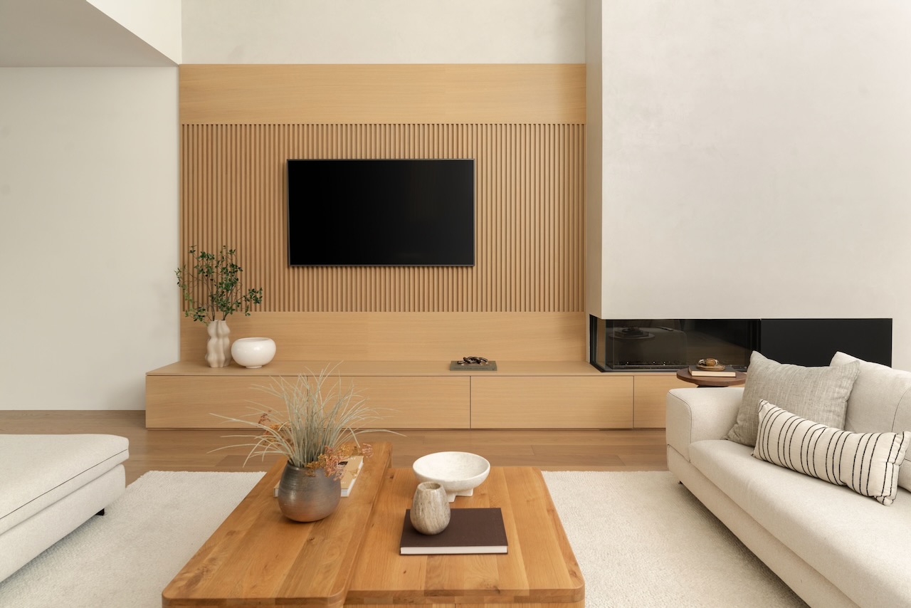 Microbond cement finished fireplace in living room.