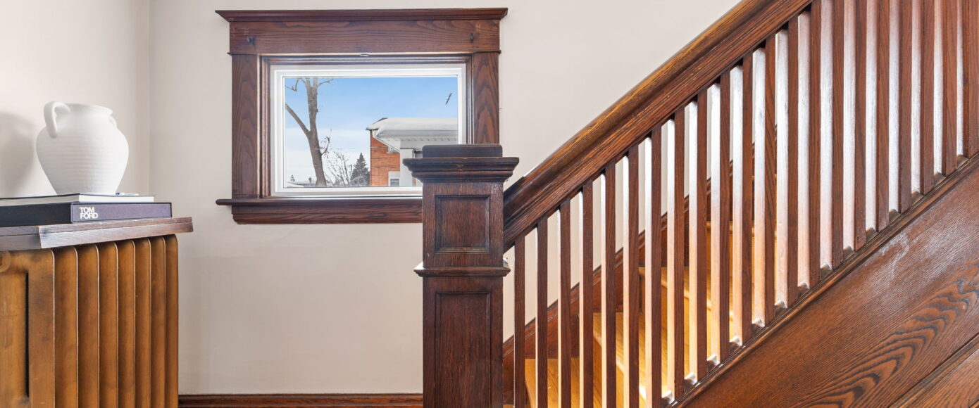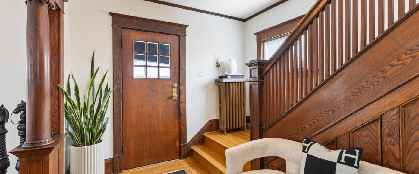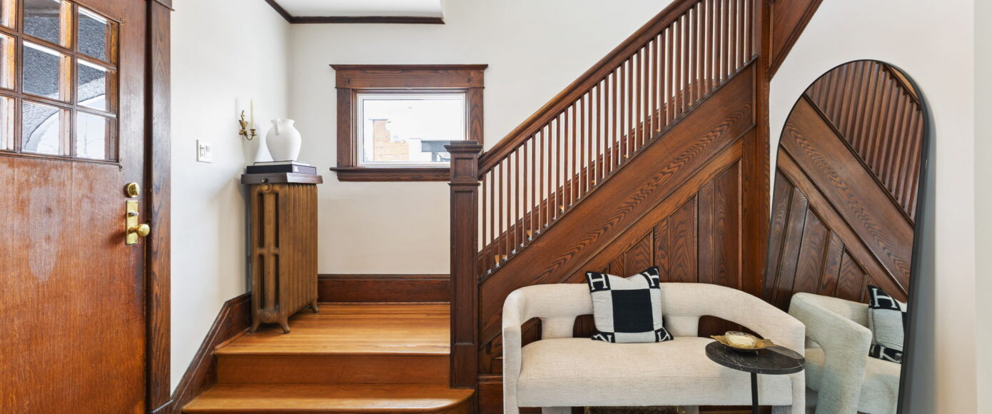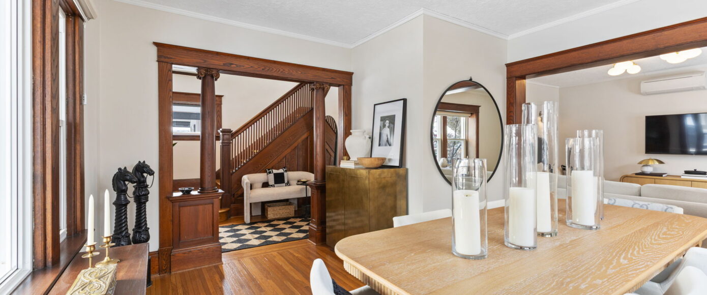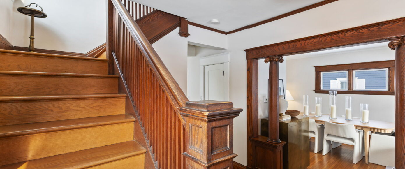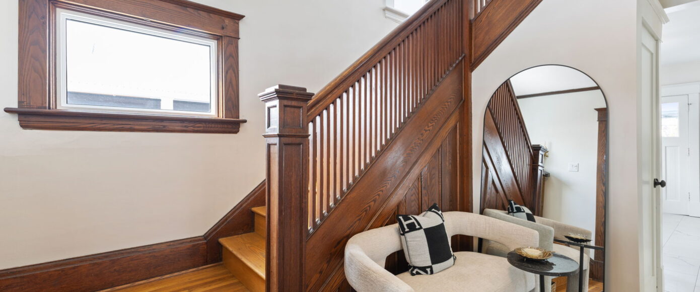 Inside, the home has been lovingly updated while preserving its historic integrity. The open-concept living and dining rooms are filled with natural light and feature high ceilings, beautifully restored period trim, and an impressive original staircase that has been meticulously brought back to life. Gleaming hardwood floors run throughout, adding warmth and continuity to the space while enhancing the home’s authentic character.