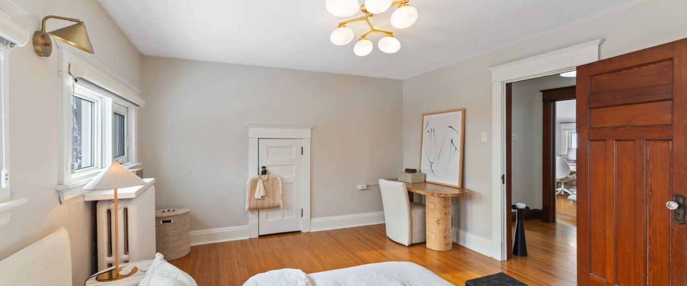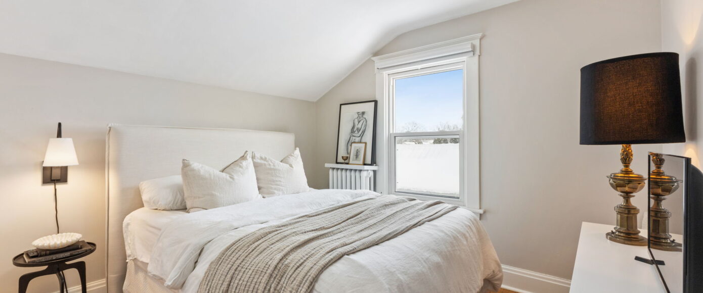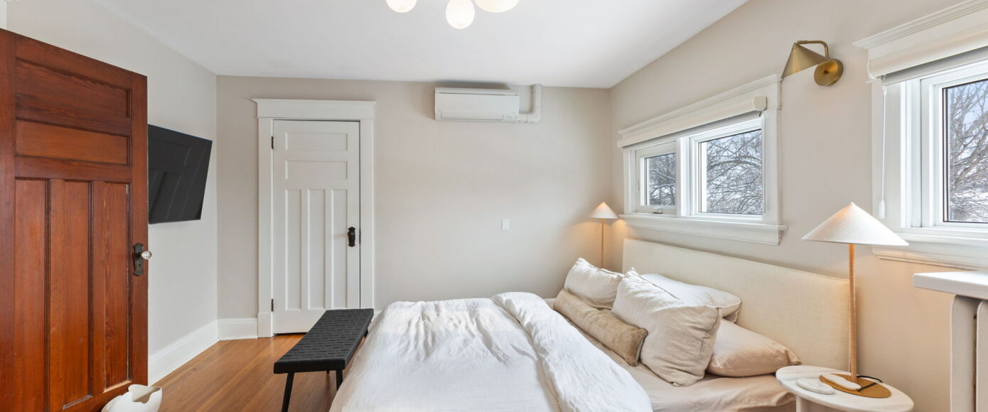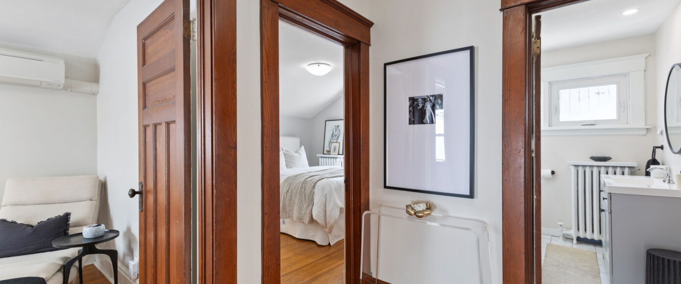 Upstairs, the home continues to impress. The spacious principal bedroom features a large picture window that floods the room with natural light, along with a generous closet for everyday comfort. The main bathroom has been thoughtfully redesigned with modern finishes that complement the home’s heritage, blending clean lines with timeless appeal. Two additional guest bedrooms are both well-proportioned, offering excellent light, storage, and flexibility for family, guests, or a home office.