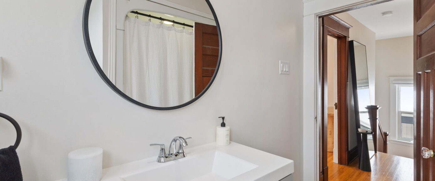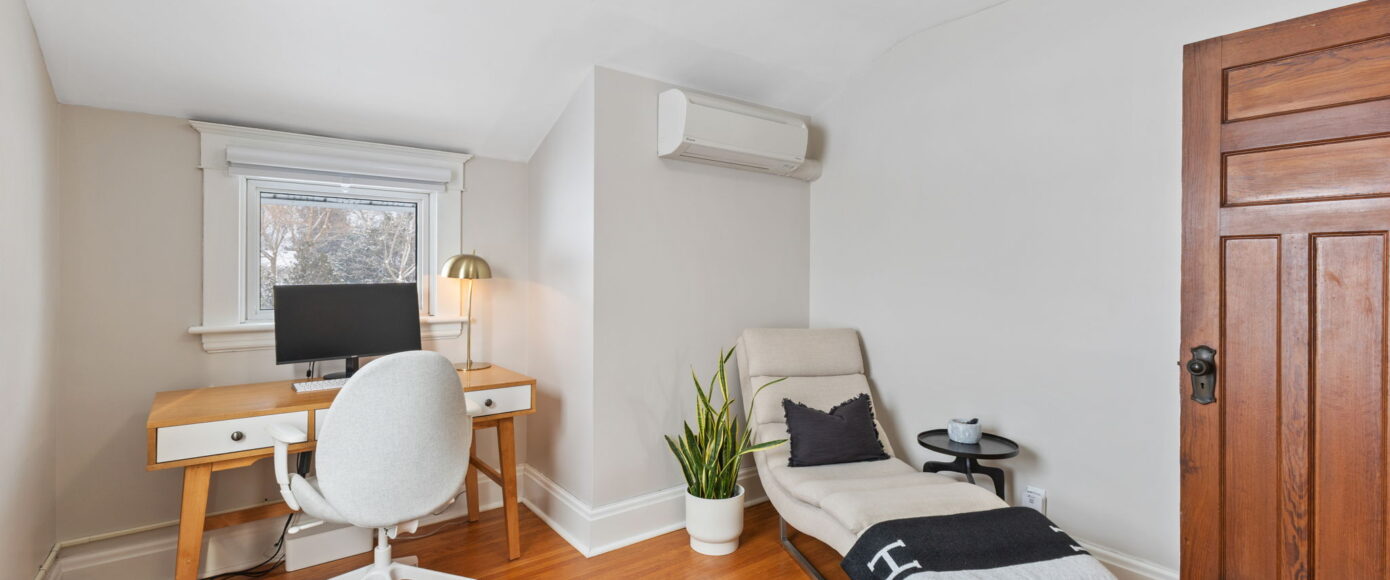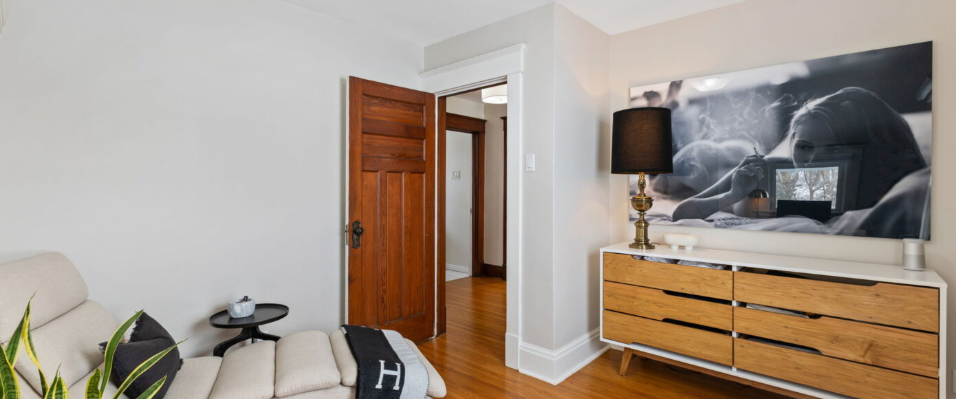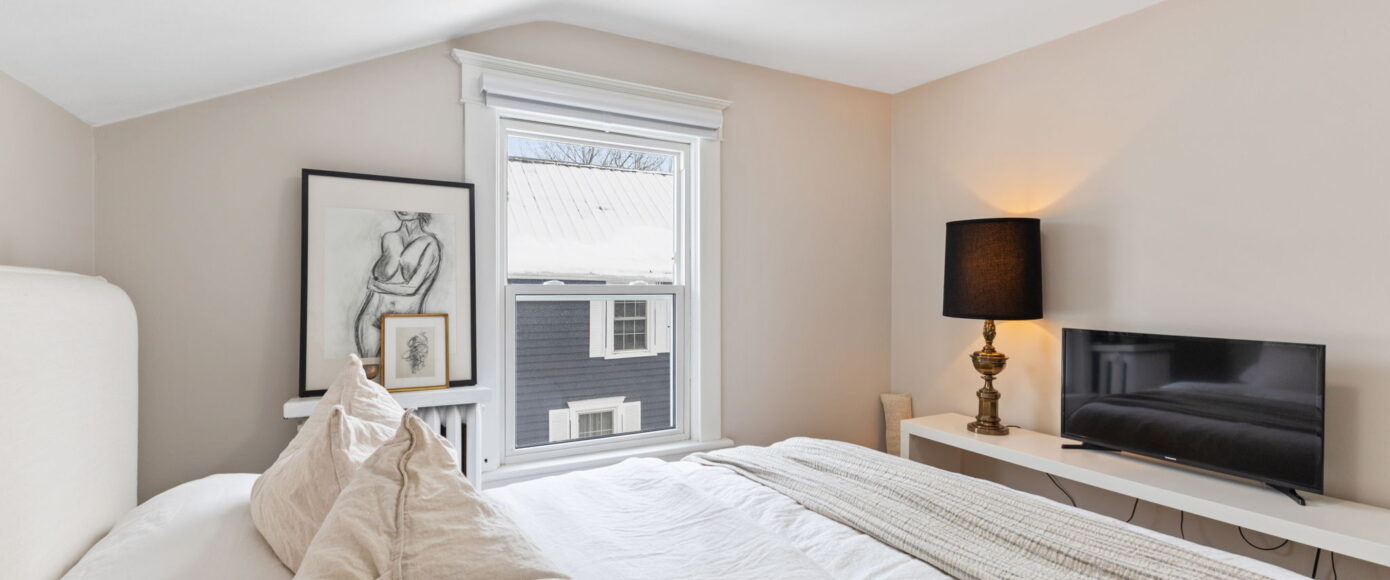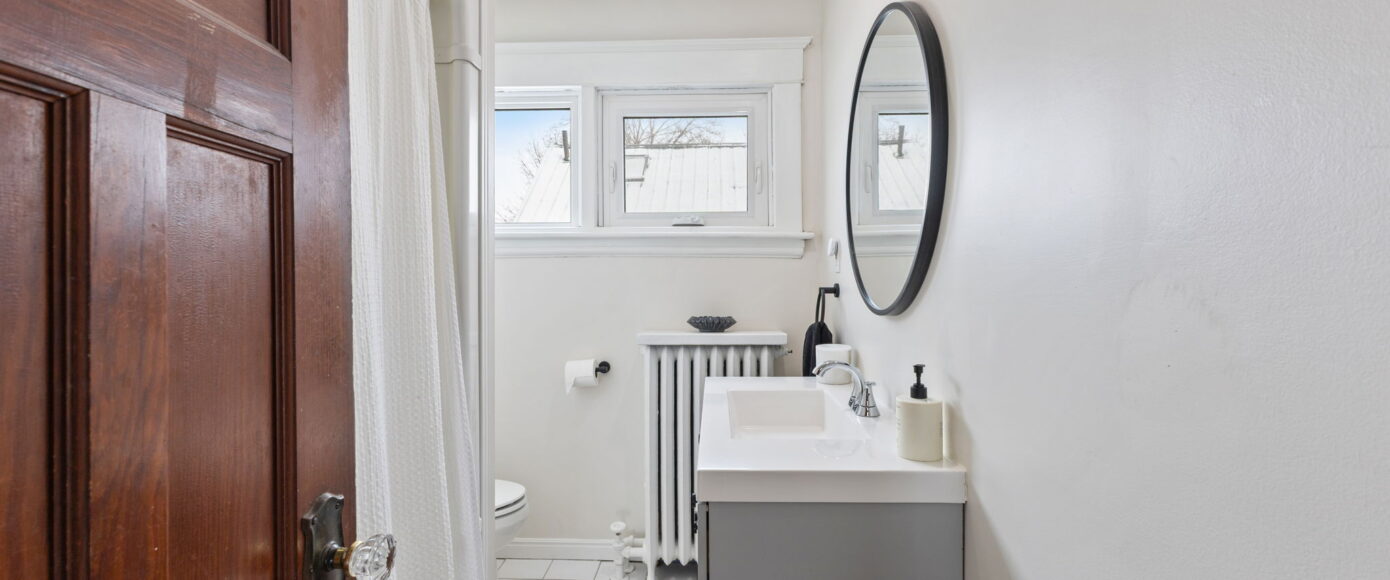 Upstairs, the home continues to impress. The spacious principal bedroom features a large picture window that floods the room with natural light, along with a generous closet for everyday comfort. The main bathroom has been thoughtfully redesigned with modern finishes that complement the home’s heritage, blending clean lines with timeless appeal. Two additional guest bedrooms are both well-proportioned, offering excellent light, storage, and flexibility for family, guests, or a home office.