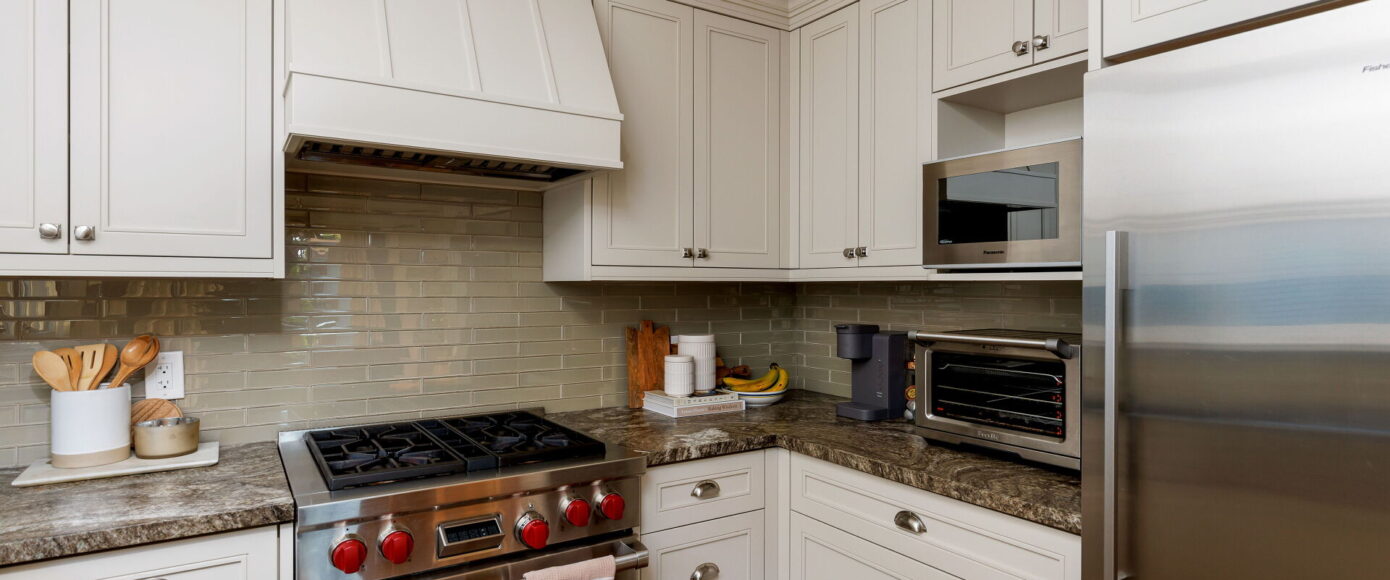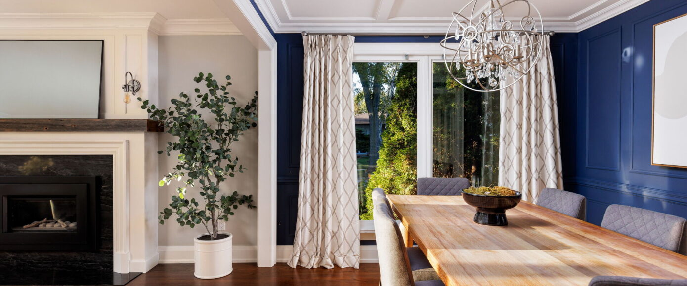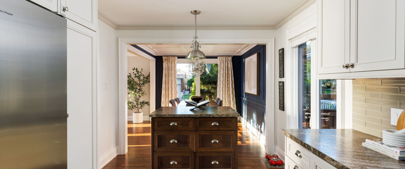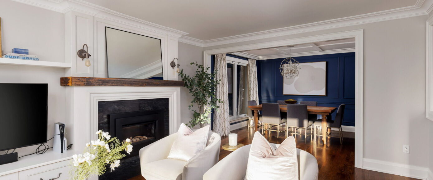 The main level is bright and welcoming, with an open flow between principal rooms and wide windows that fill the home with natural light. The living room, anchored by a fireplace, opens to the dining area — an ideal setting for both relaxed evenings and refined entertaining. The kitchen is a true highlight, featuring a rich mix of wood cabinetry, a stone island with breakfast bar, and premium Wolf, Miele, and Fisher & Paykel appliances.