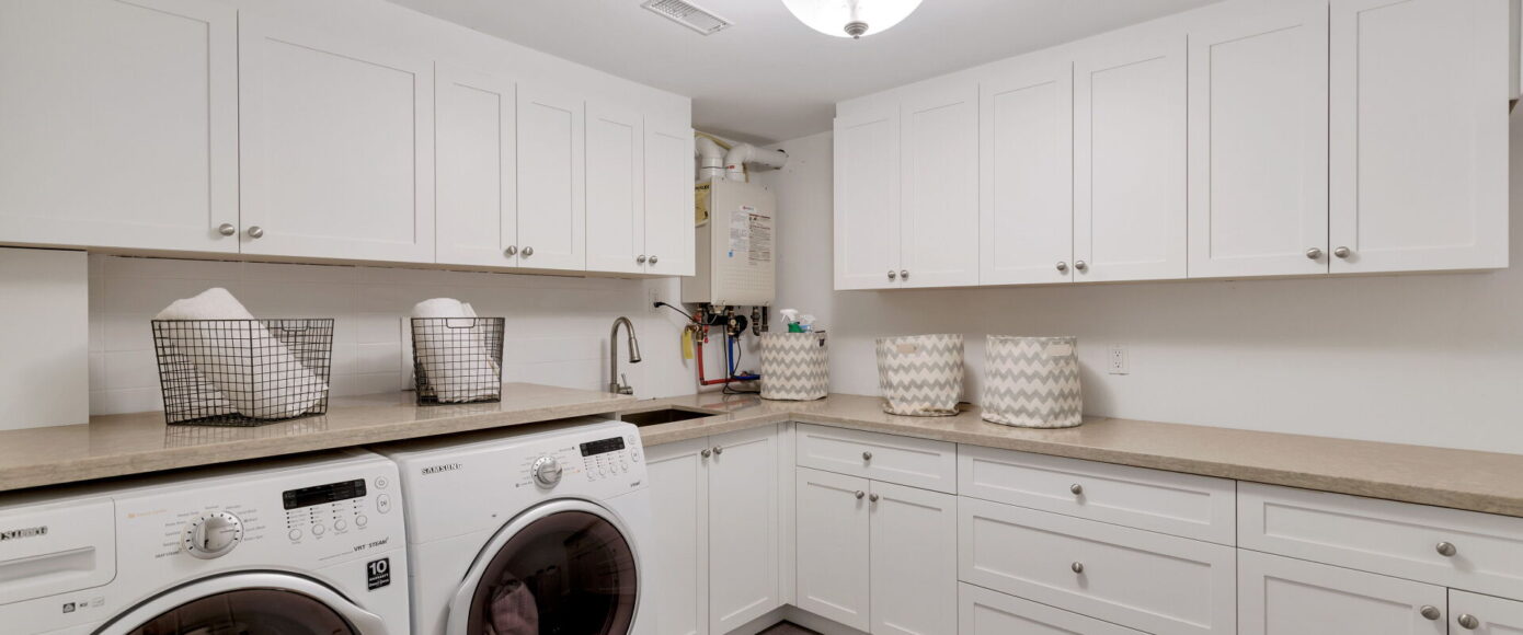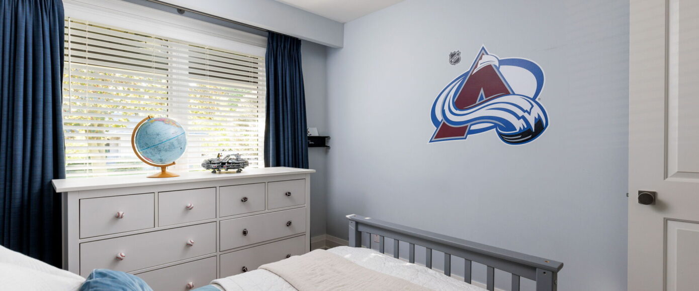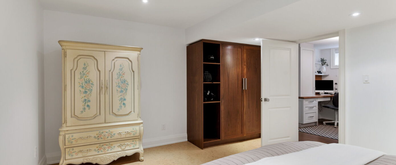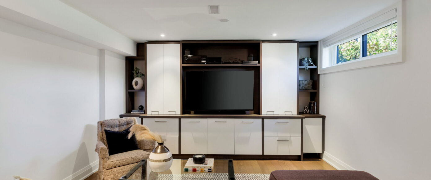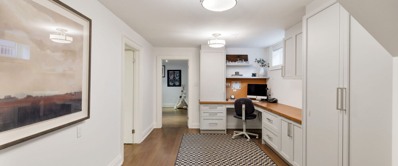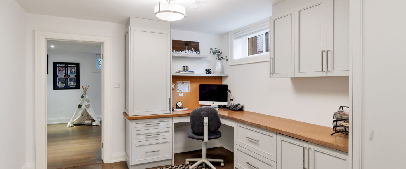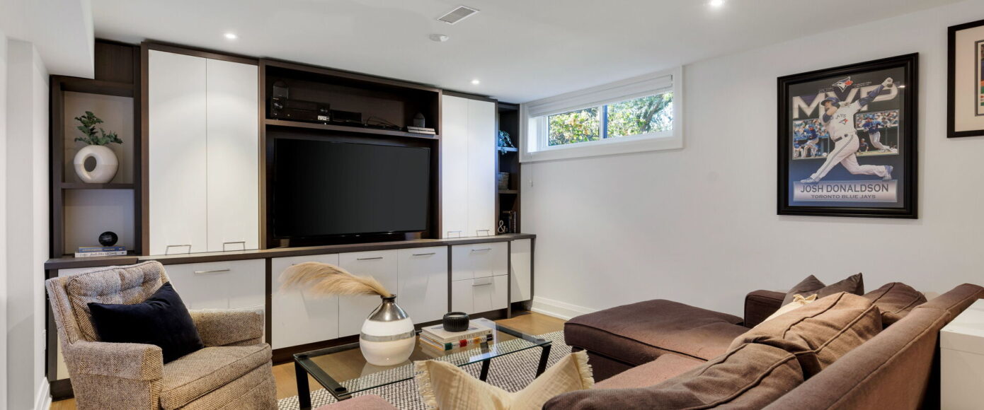 The lower level extends the home’s versatility with an impressive recreation room featuring a custom media unit and built-in storage, perfect for family movie nights or playtime. A dedicated home office with built-in desk and cabinetry offers a quiet workspace, while the spacious fourth bedroom and spa-inspired four-piece bath with heated floors make an ideal guest suite. A large laundry room with abundant cabinetry and counter space completes this well-designed level.