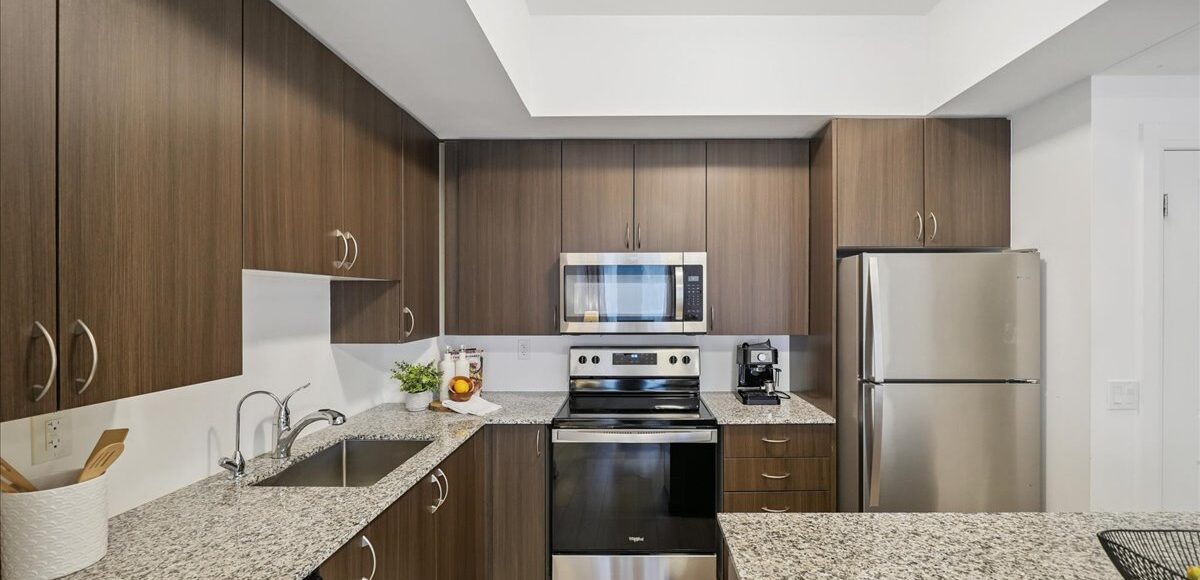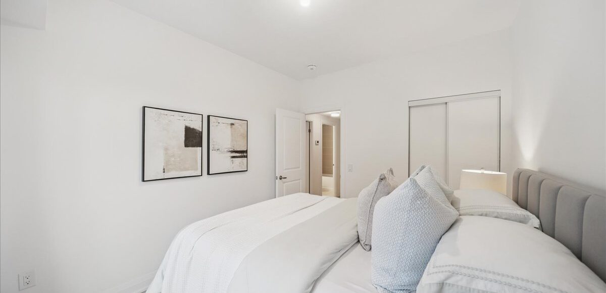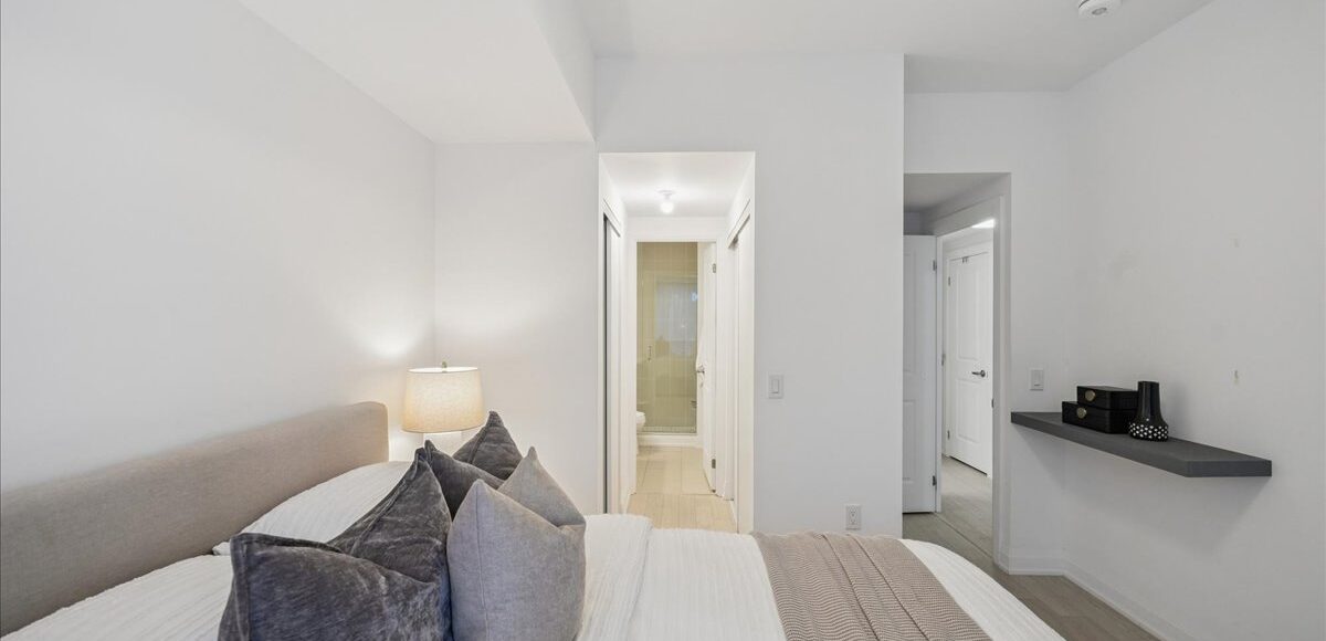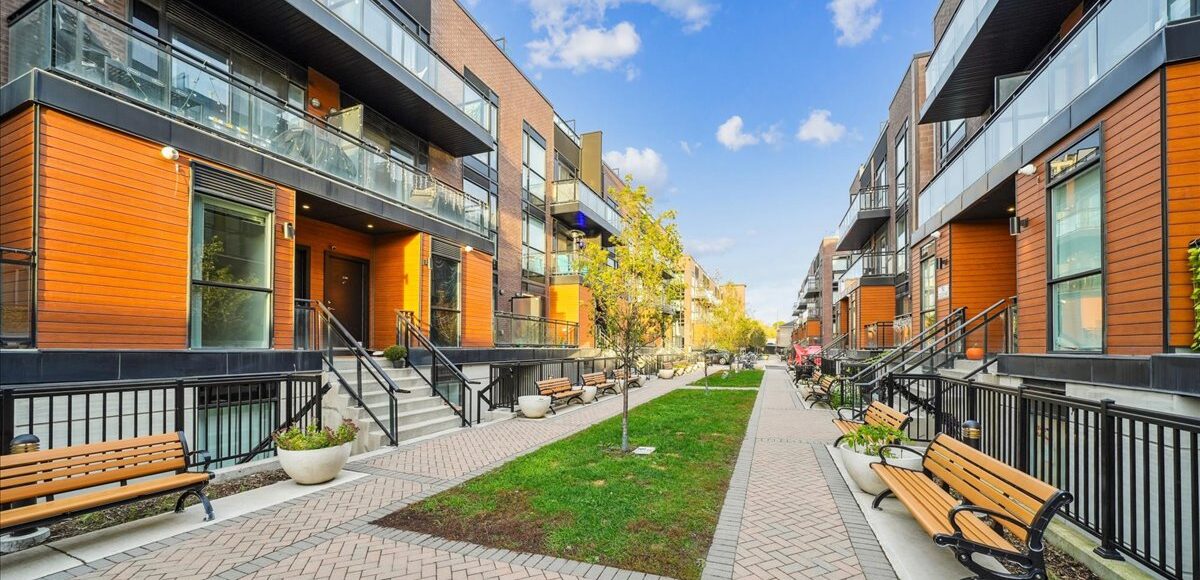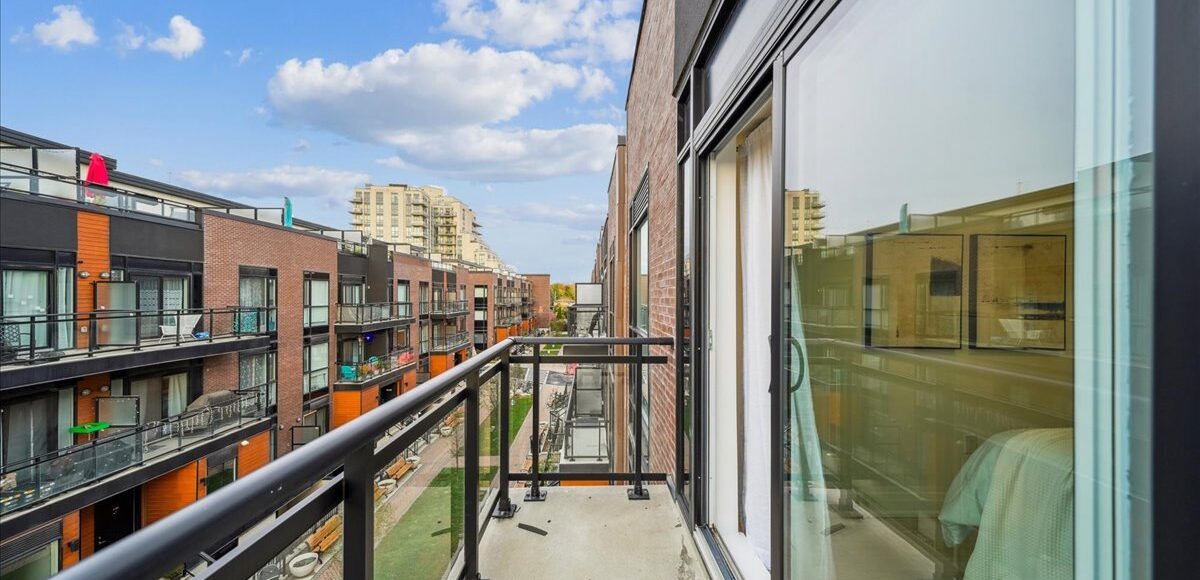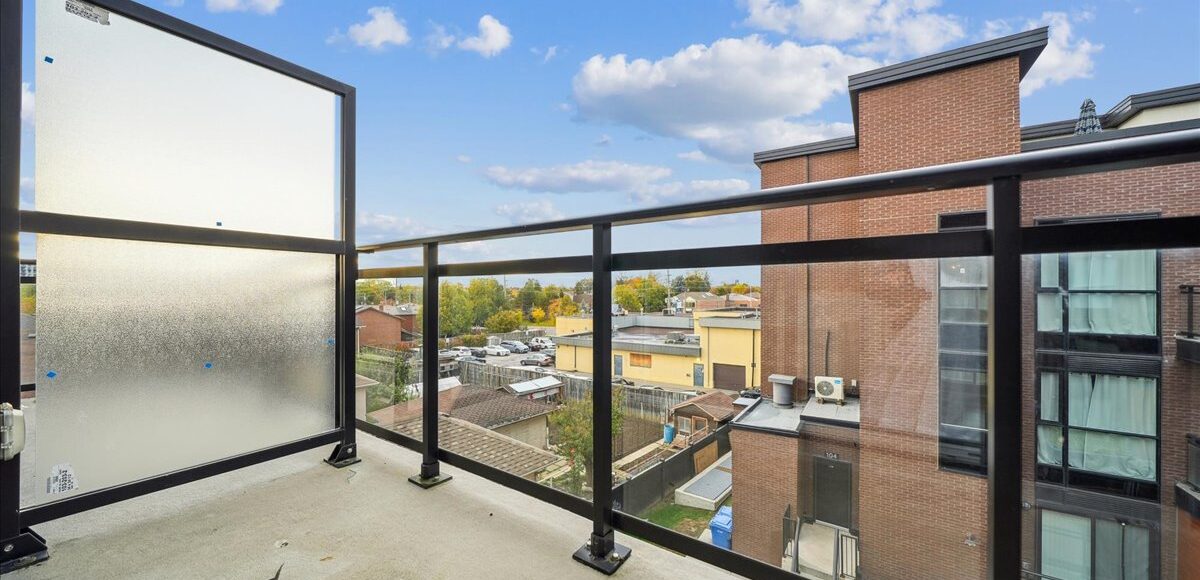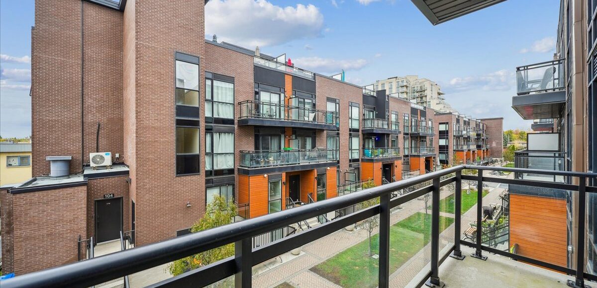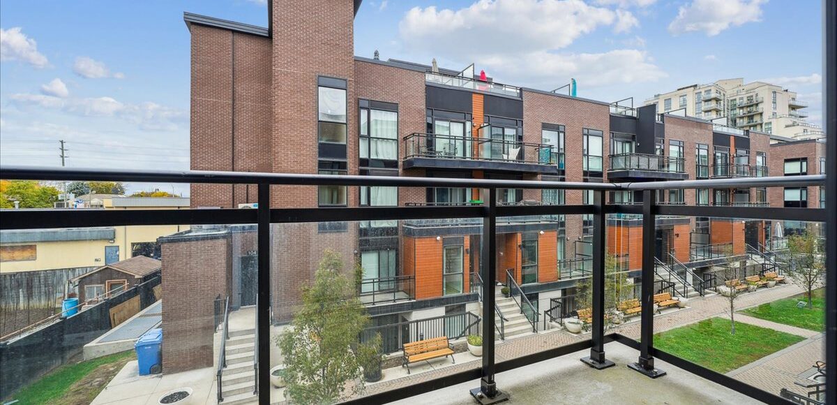 Inside: open-concept living that actually feels open – hardwood-style floors, bright pot-lit ceilings, and a kitchen built for both weekday dinners and Friday-night take-out – all opening out to a balcony on the main floor. Quartz counters, full-size stainless appliances, and a centre island that doubles as your best dinner-party wingman. Upstairs, two spacious bedrooms and two full baths deliver real privacy. The primary suite includes a walk-in closet and spa-style ensuite, while the second bedroom opens to its own balcony. And when you need fresh air – skip the crowded patios. Head up to your private rooftop terrace with open air views and enough space for a sectional, grill, and Sunday-morning coffee. Downstairs, two parking spaces and a locker keep life simple.