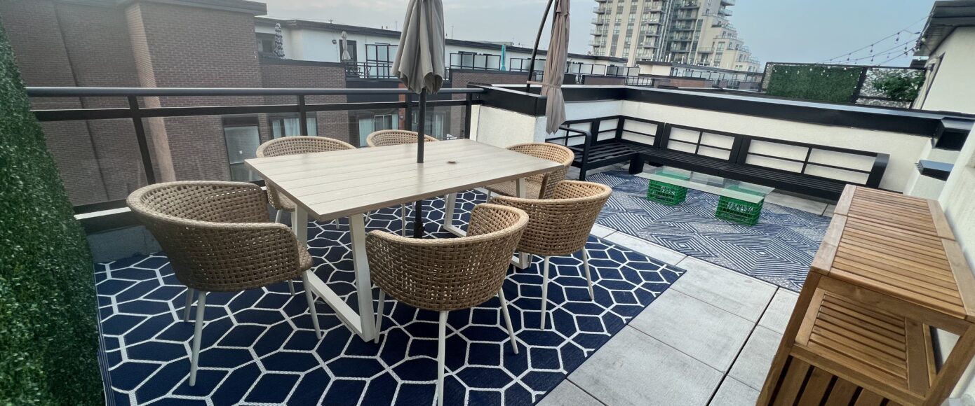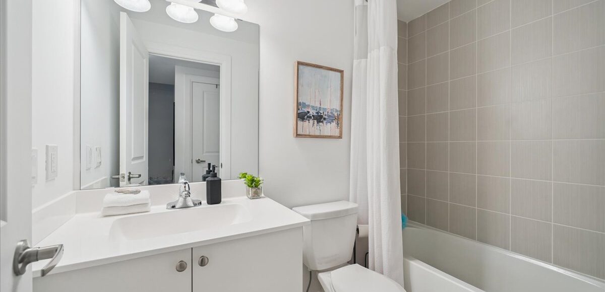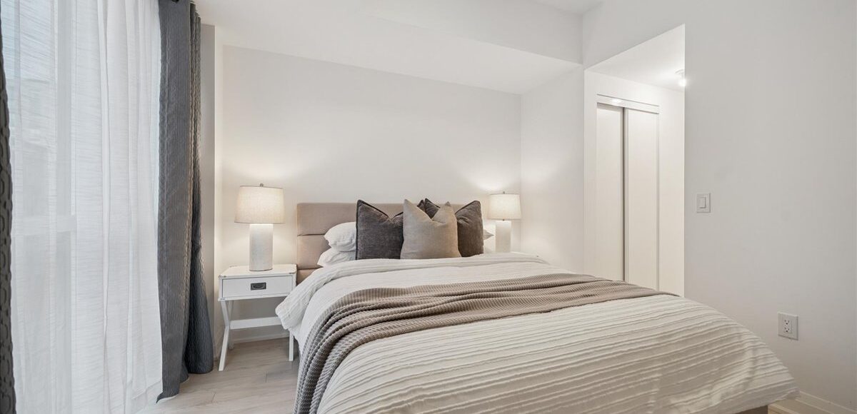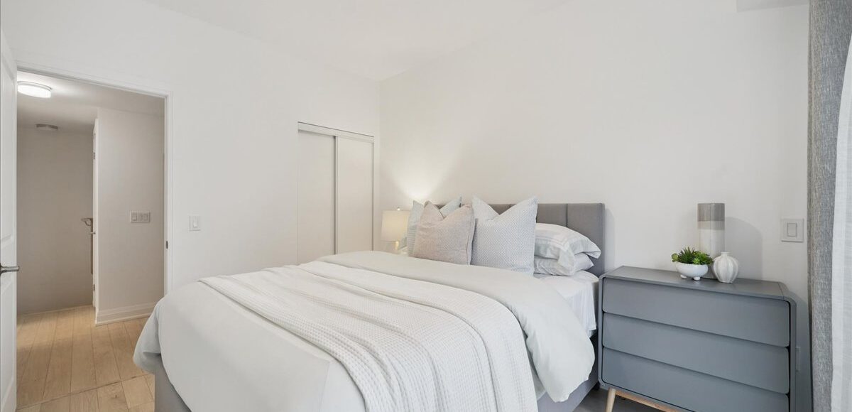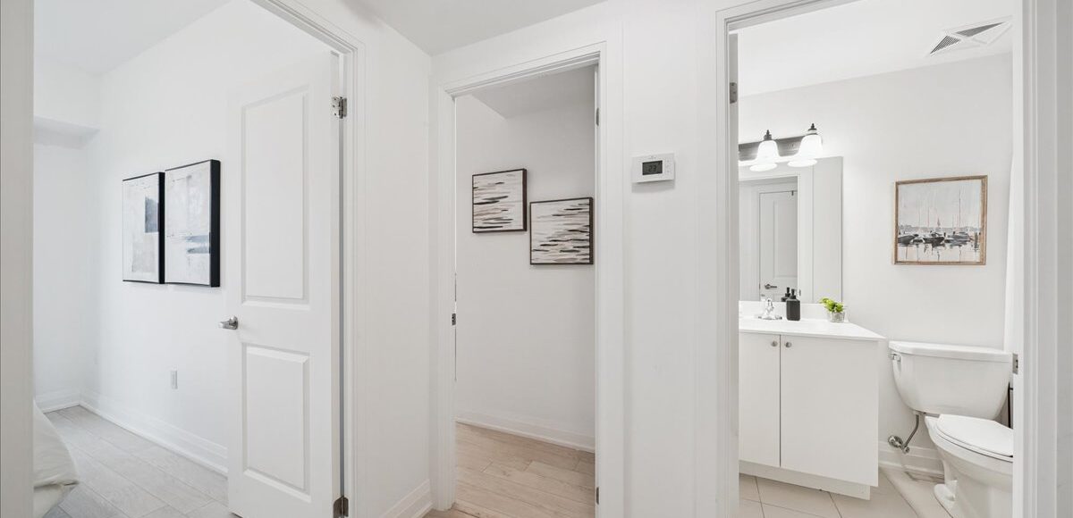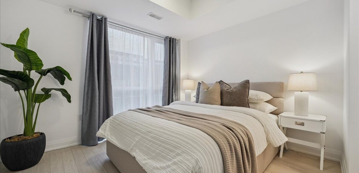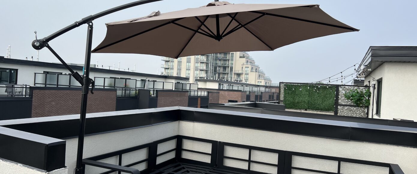Inside: open-concept living that actually feels open – hardwood-style floors, bright pot-lit ceilings, and a kitchen built for both weekday dinners and Friday-night take-out – all opening out to a balcony on the main floor. Quartz counters, full-size stainless appliances, and a centre island that doubles as your best dinner-party wingman. Upstairs, two spacious bedrooms and two full baths deliver real privacy. The primary suite includes a walk-in closet and spa-style ensuite, while the second bedroom opens to its own balcony. And when you need fresh air – skip the crowded patios. Head up to your private rooftop terrace with open air views and enough space for a sectional, grill, and Sunday-morning coffee. Downstairs, two parking spaces and a locker keep life simple.