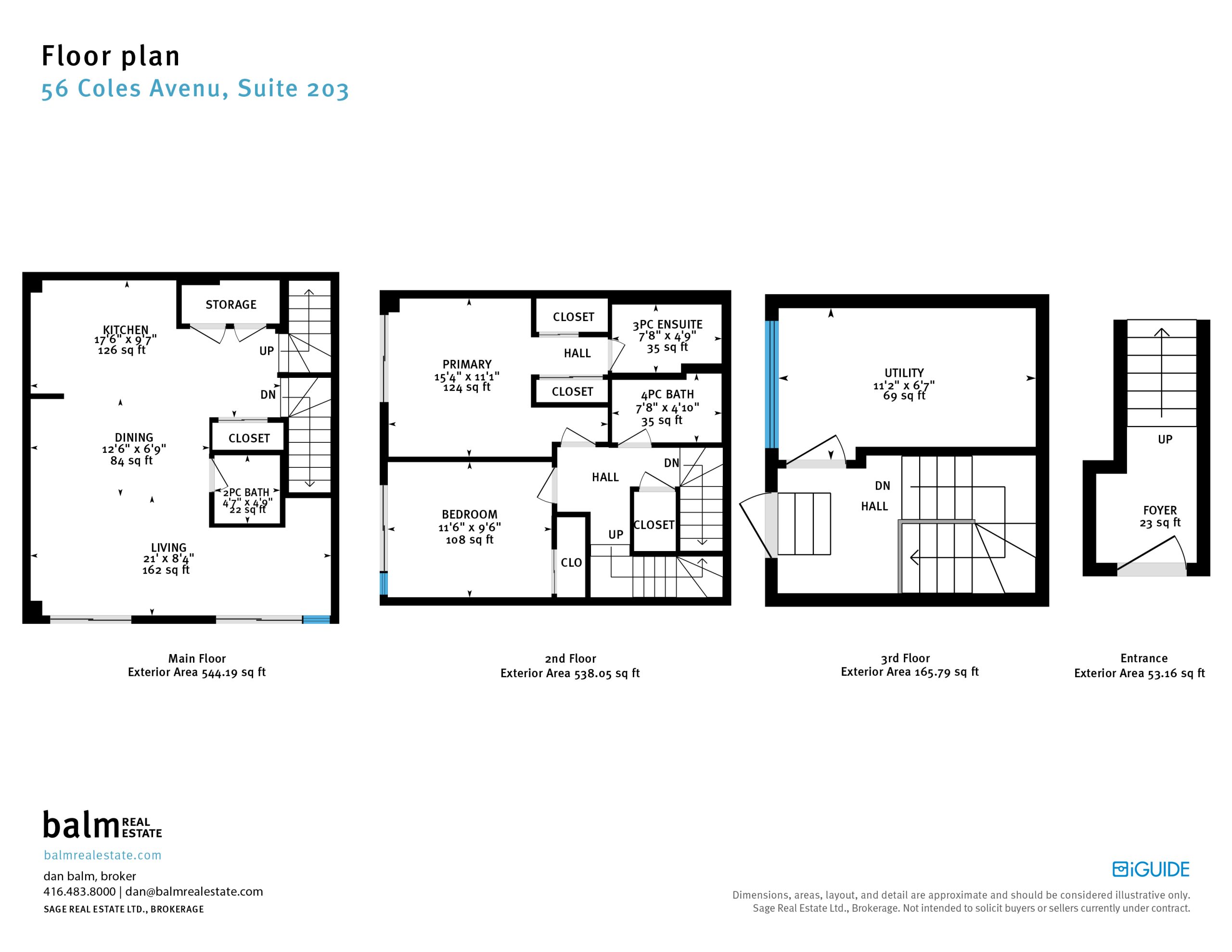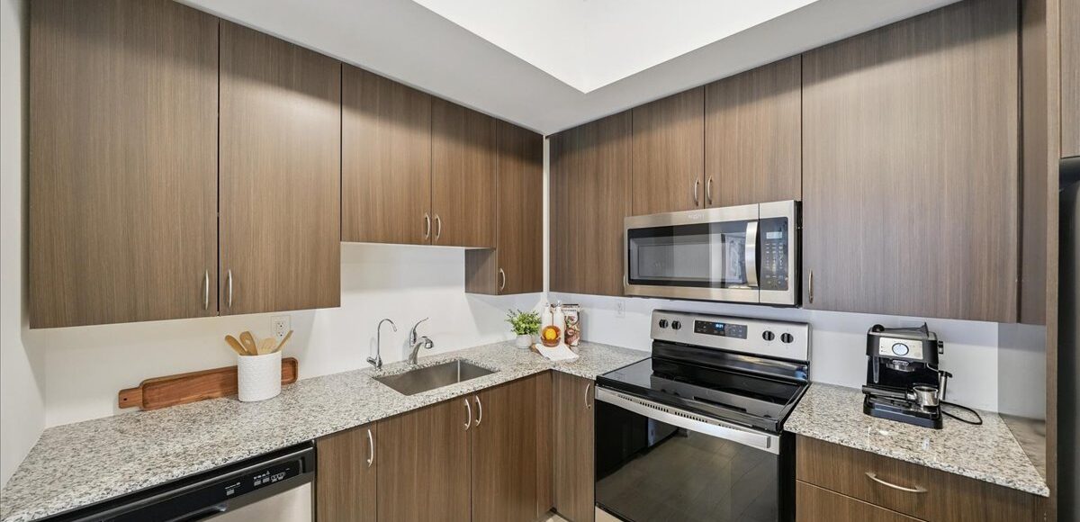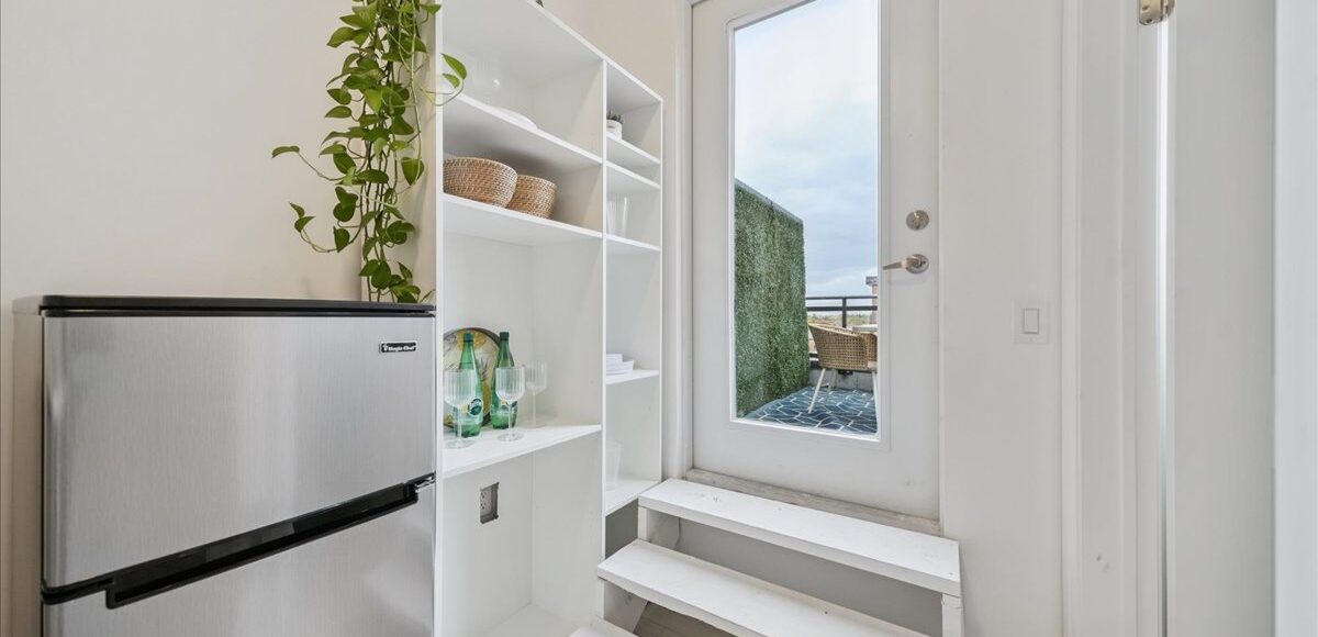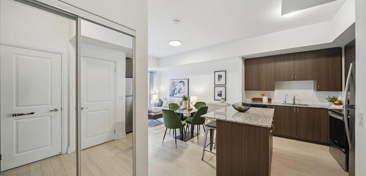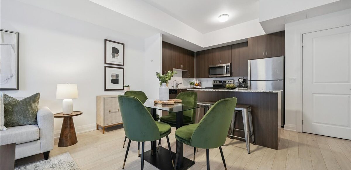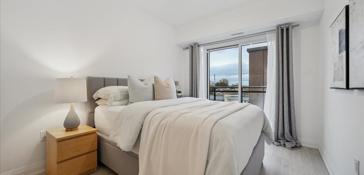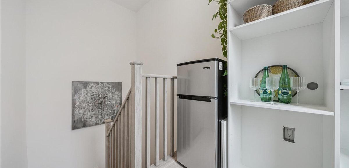 Inside: open-concept living that actually feels open – hardwood-style floors, bright pot-lit ceilings, and a kitchen built for both weekday dinners and Friday-night take-out – all opening out to a balcony on the main floor. Quartz counters, full-size stainless appliances, and a centre island that doubles as your best dinner-party wingman. Upstairs, two spacious bedrooms and two full baths deliver real privacy. The primary suite includes a walk-in closet and spa-style ensuite, while the second bedroom opens to its own balcony. And when you need fresh air – skip the crowded patios. Head up to your private rooftop terrace with open air views and enough space for a sectional, grill, and Sunday-morning coffee. Downstairs, two parking spaces and a locker keep life simple.