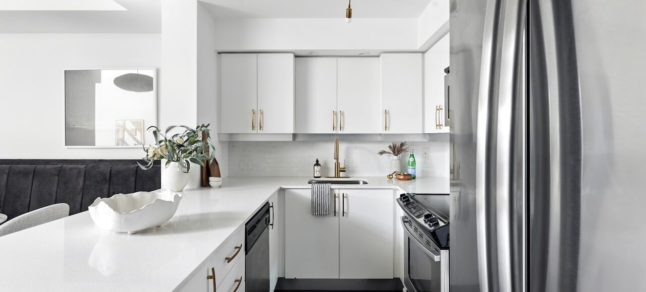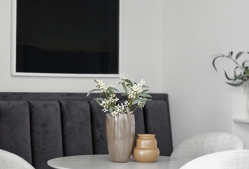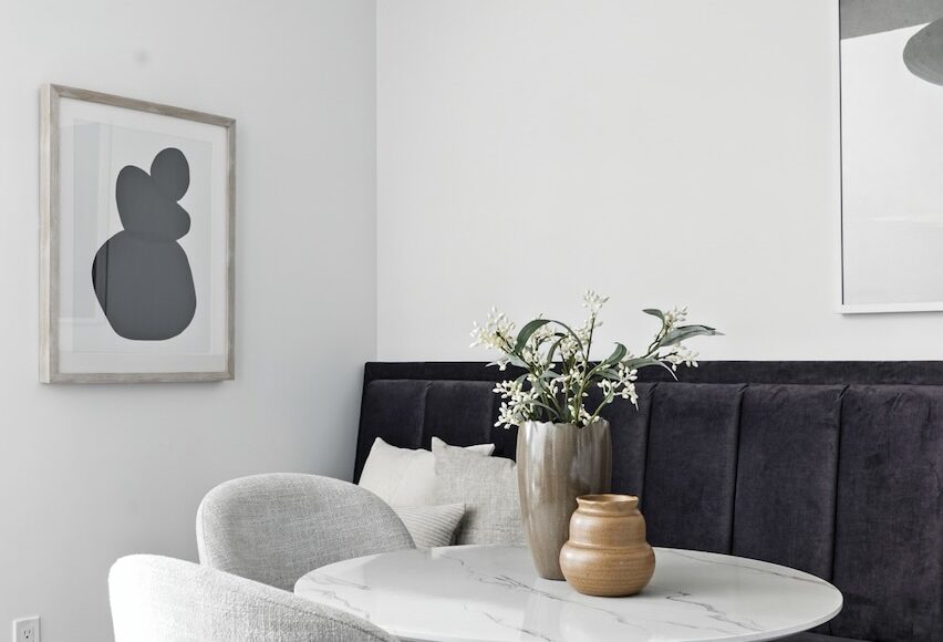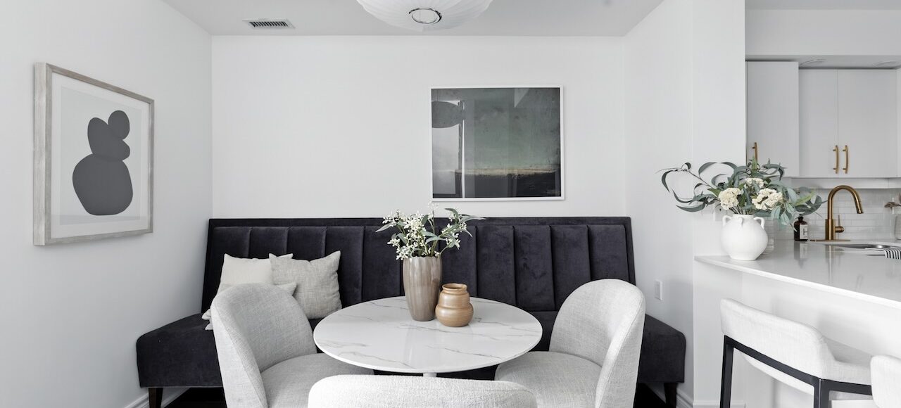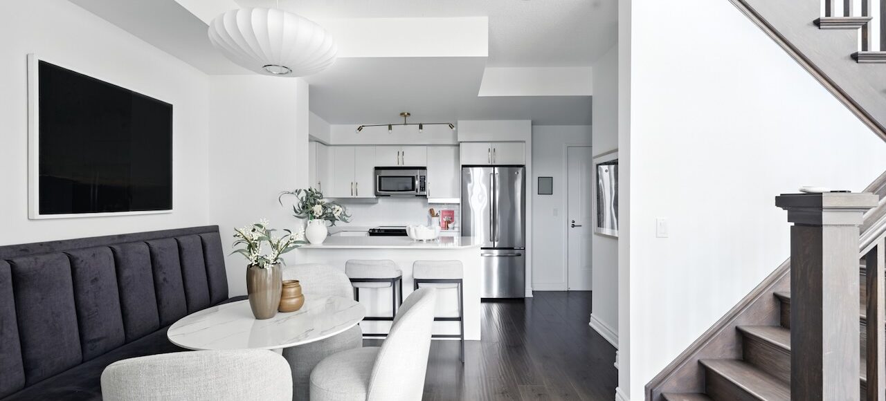 The open main floor is designed for both entertaining and everyday living. The kitchen, complete with a full-sized fridge, warm hardwood flooring, and gold accents, connects seamlessly with the living and dining areas. A custom banquette sets the stage for long dinners with friends, while the fireplace with marble trim adds a cozy focal point in the colder months.