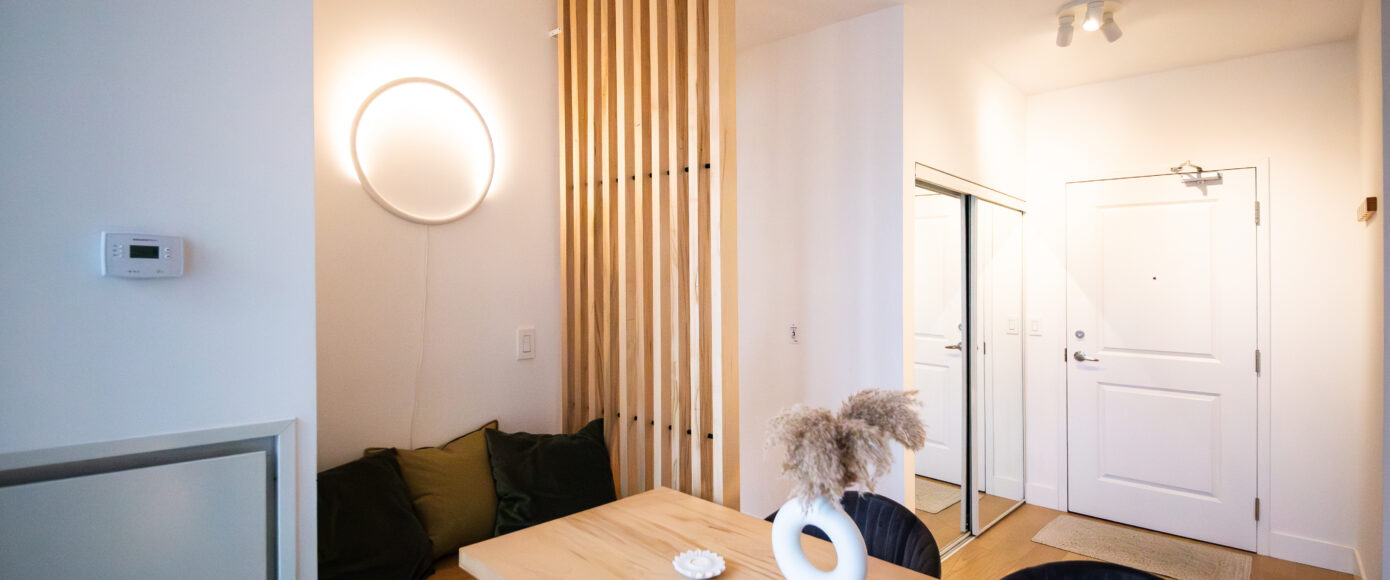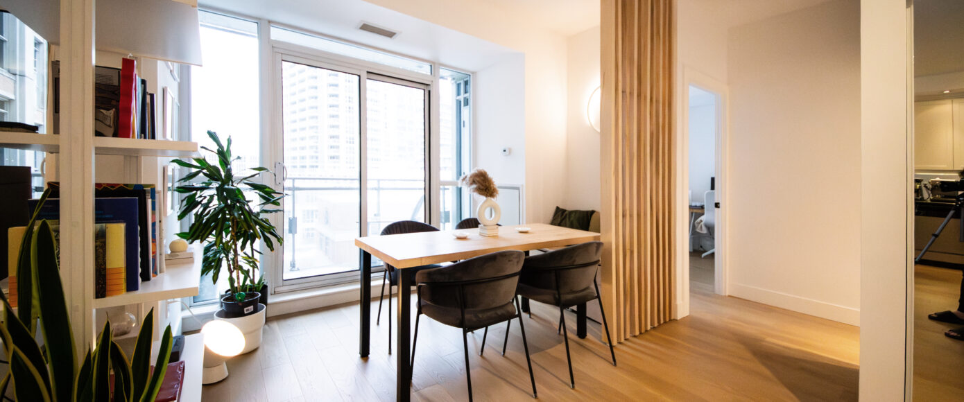The open living space is anchored by new hardwood flooring, bringing warmth and cohesion throughout the unit. Just off the main living area, a dedicated dining room features a custom built-in table with integrated seating and architectural wood paneling, creating a stylized, intentional space you rarely find in condo living. It’s ideal for hosting, working from home, or enjoying everyday meals in a setting that feels more like a home than a typical condo layout.
