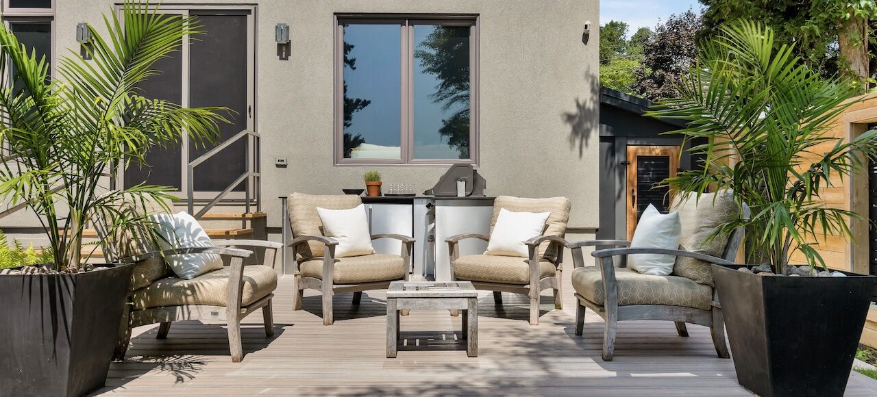 Main Floor Back Patio: Custom kitchen with built-in fridge and Napoleon gas BBQ.