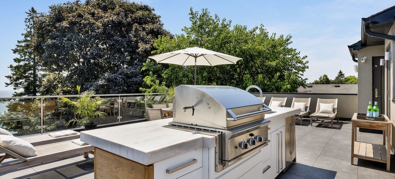 Rooftop: Custom kitchen with built-in fridge, Fisher & Paykel gas BBQ & outdoor gas fireplace.