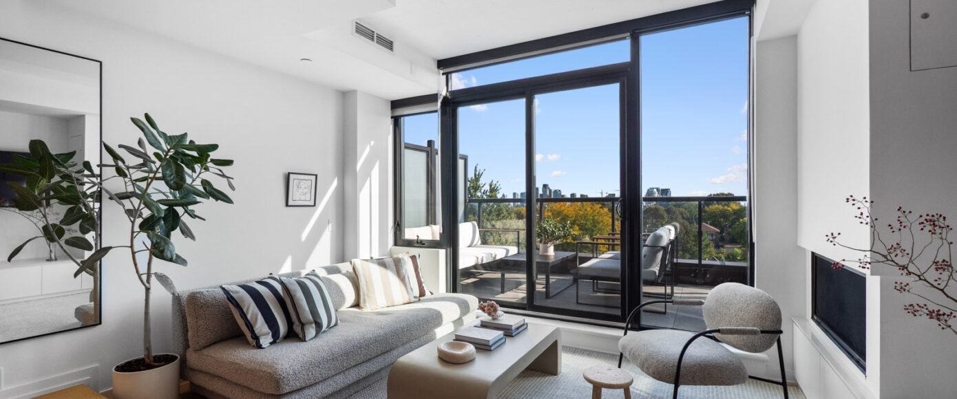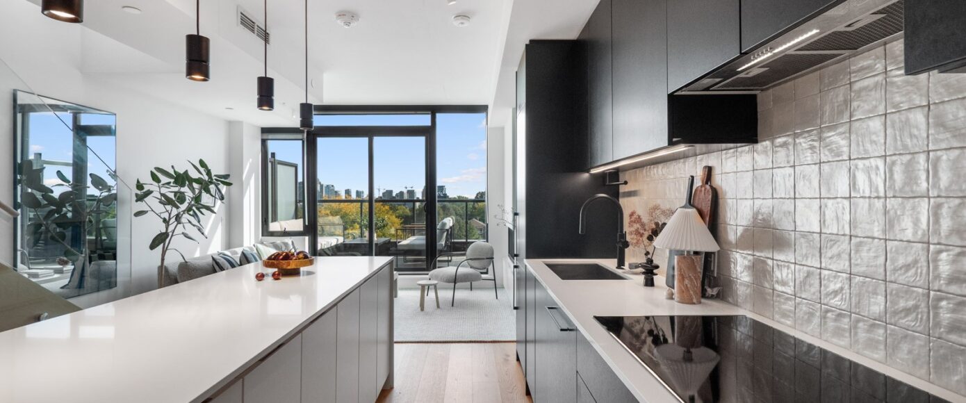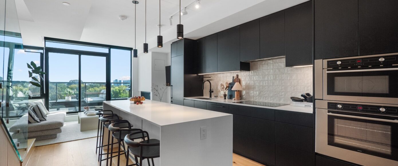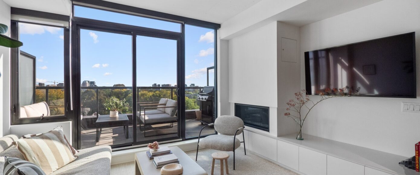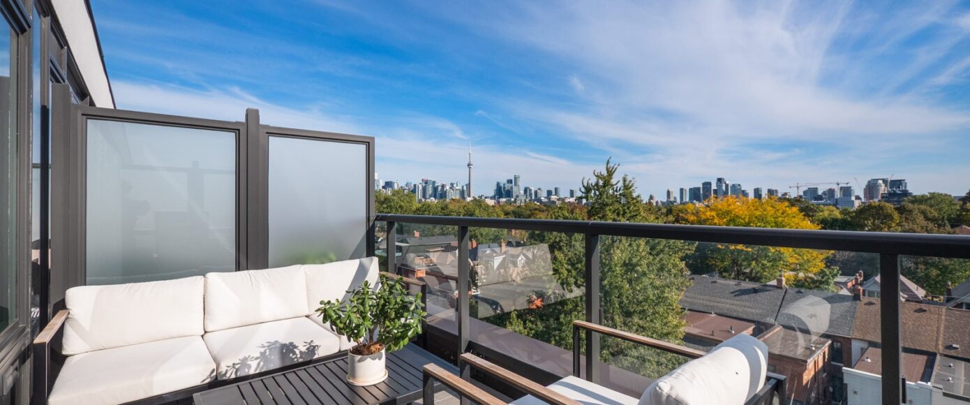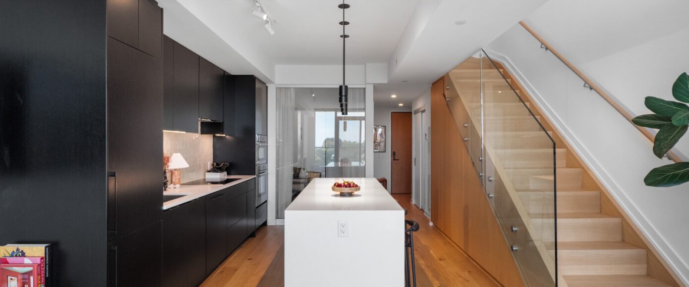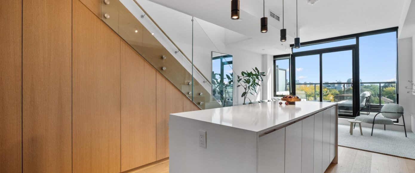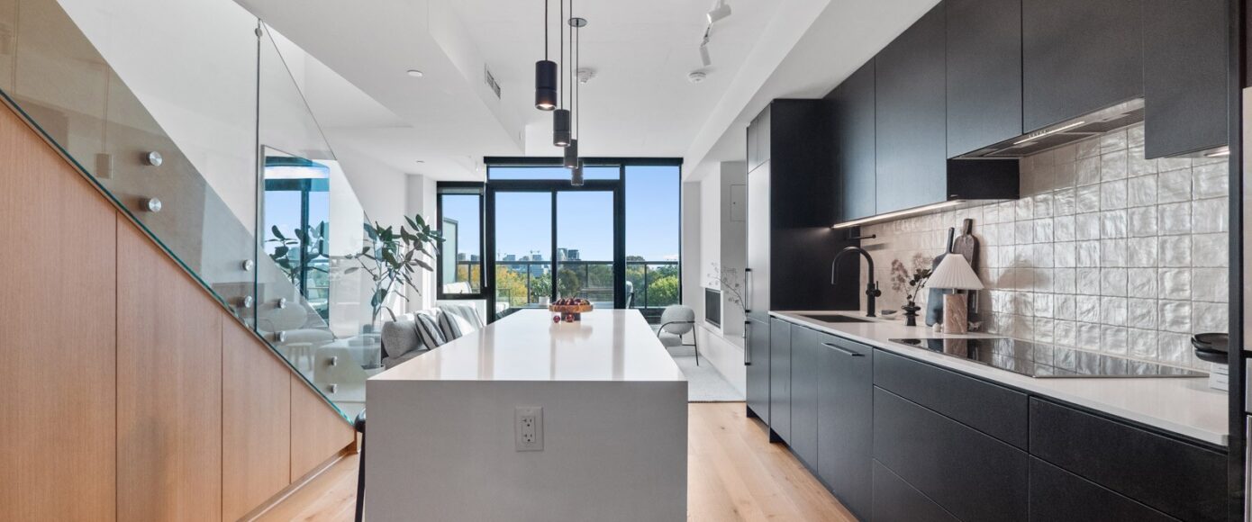 Inside, natural light pours through south-facing floor-to-ceiling windows, framing skyline and lake views that stretch from Trinity Bellwoods to the CN Tower. The main floor flows seamlessly from a chef ’s kitchen with custom black cabinetry and waterfall island, to an airy living space that opens to two private terraces — ideal for morning coffee or sunset cocktails.