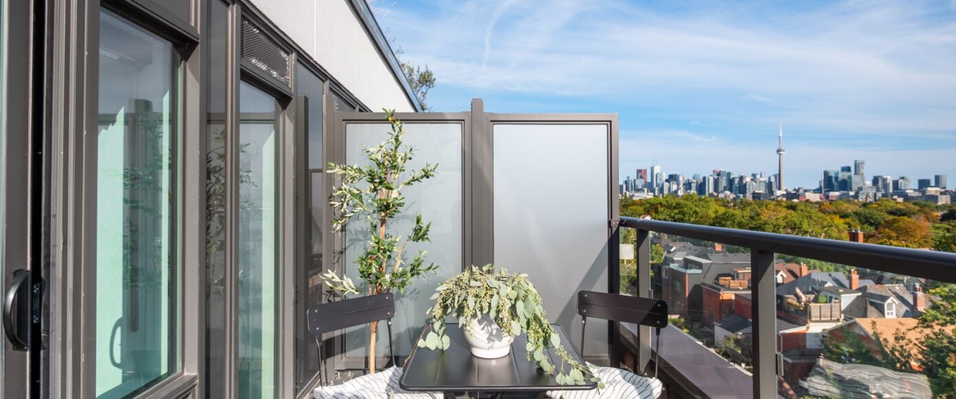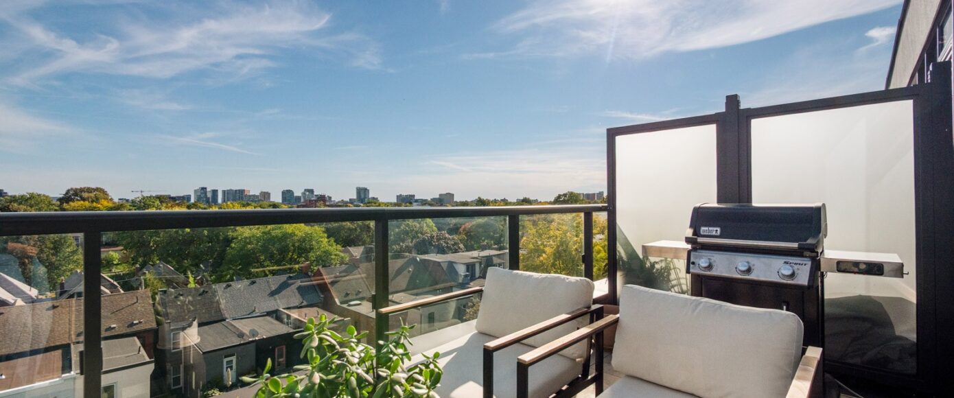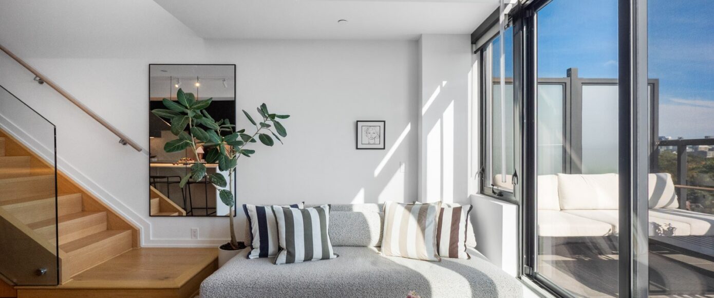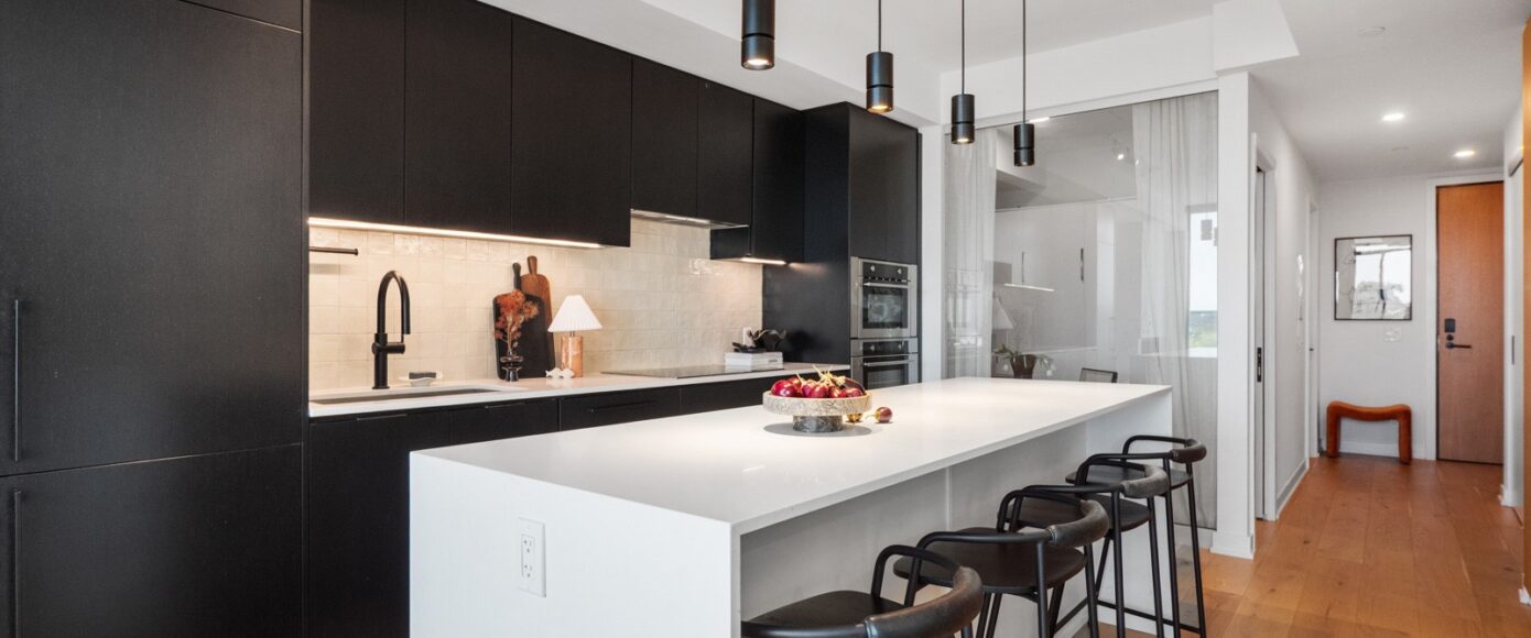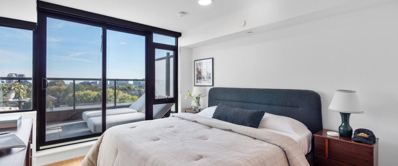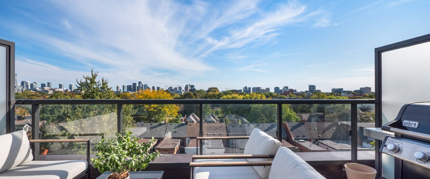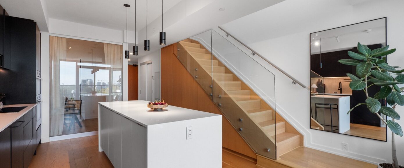 Inside, natural light pours through south-facing floor-to-ceiling windows, framing skyline and lake views that stretch from Trinity Bellwoods to the CN Tower. The main floor flows seamlessly from a chef ’s kitchen with custom black cabinetry and waterfall island, to an airy living space that opens to two private terraces — ideal for morning coffee or sunset cocktails.