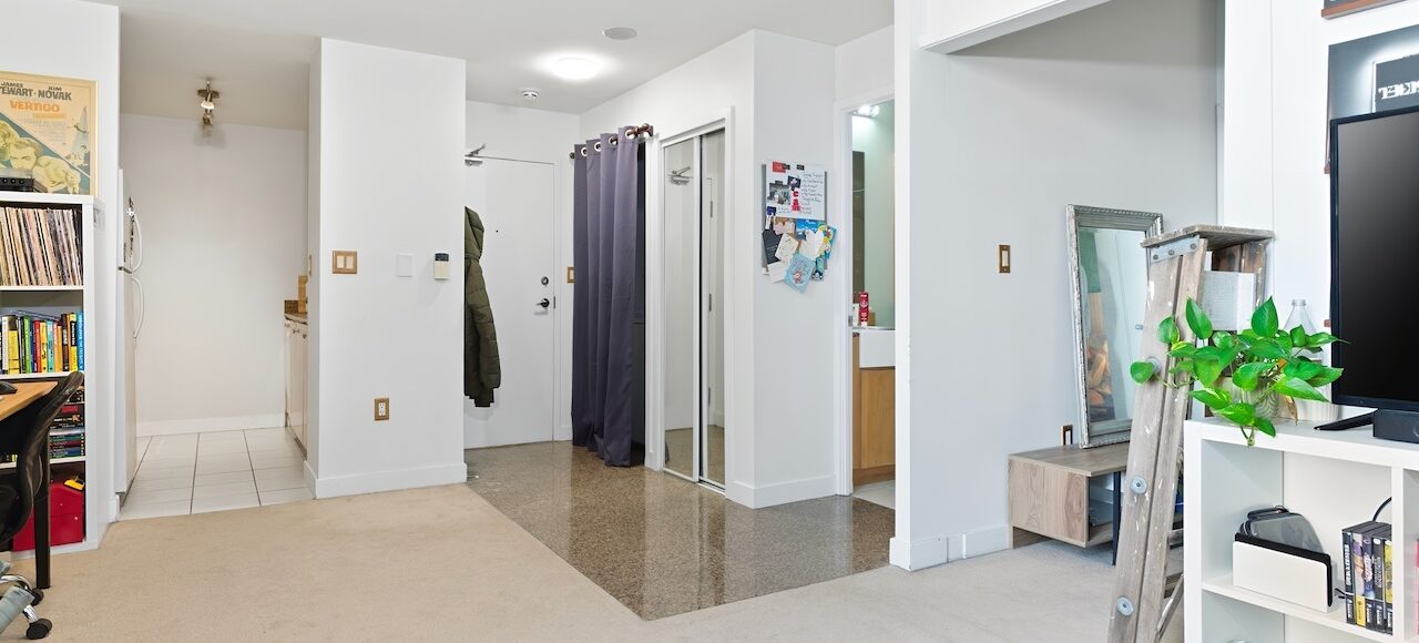 Inside, the space is versatile and very livable, with 9’ ceilings, a gas stove, and more layout flexibility than most one-bedroom units of its size.